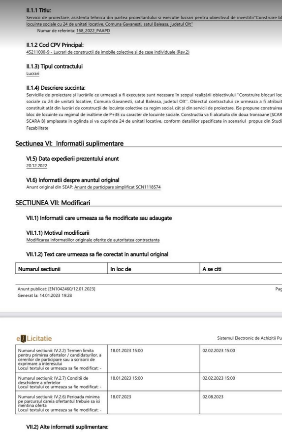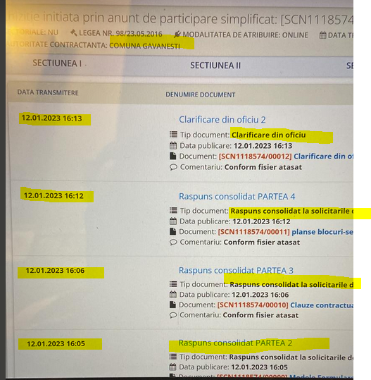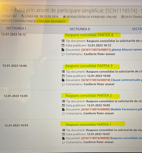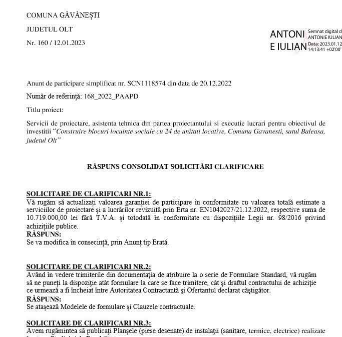 Ne întoarcem la consultanță. Firma și consultantul, neconsemnate în anunțurile licitației, o găsim într-una din cele 4 erate, din care 2 date pe 12.01.2023, mai exact un răspund de clarificare, în cadrul licitației de la Găvănești. In aceeași zi au fost postate pe Sicap și răspunsurile consolidate la solicitările de clarificare, dar și clarificările din oficiu.