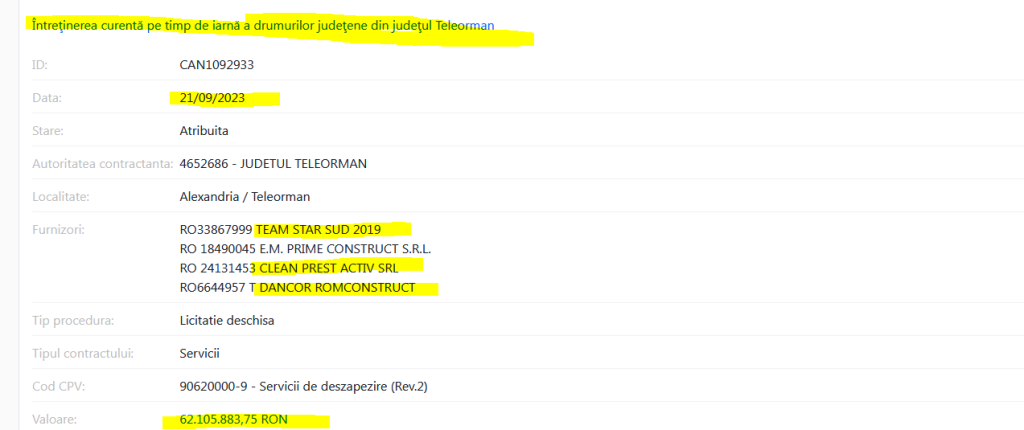 Team Star Sud 2019 intră în asociere cu firmele fraților Ciocan și într-o altă licitație, atribuită în data de 21 septembrie 2023, în județul Teleorman/Întreţinerea curentă pe timp de iarnă a drumurilor judeţene din judeţul Teleorman/valoare 12.805.337 EUR, pentru servicii de deszăpezire, unde alături de T Dancor Romconstruct apare și Clean Prest Activ Srl.