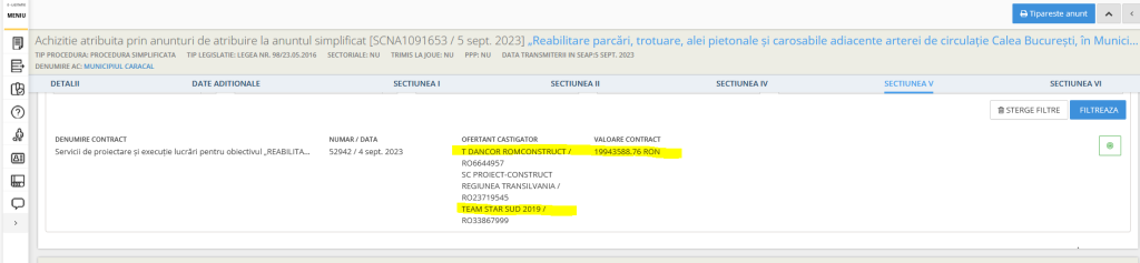 „Reabilitare parcări, trotuare, alei pietonale și carosabile adiacente arterei de circulație Calea București, în Municipiul Caracal, județul Olt”, licitație în valoare de 19.943.588,76 RON/fără Tva/ 4.112.080 EUR, a fost atribuită în data de 5 septembrie 2023, de T Dancor Romconstruct, în asociere pe execuția lucrărilor cu firma Team Star Sud 2019.