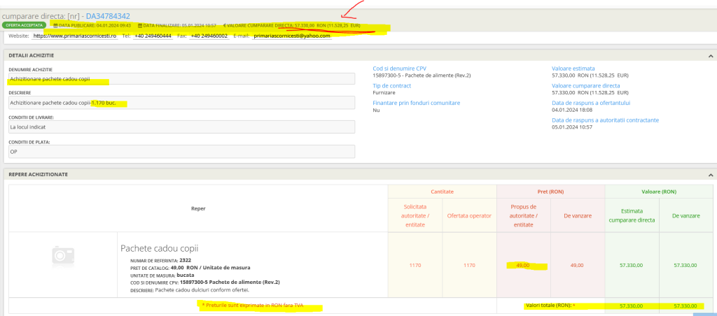 A intrat la portofelul lui tata, mai mult decât serviciile de asistență și consultanță informatică pentru angajații din primărie. Peste 20 000 de euro, cât o locuință în Scornicești, într-o singură zi, pe 4 ianuarie 2024, din bugetul local, oferte pe dar, de la primar! Și nu a fost decât ziua a 4 a din an!