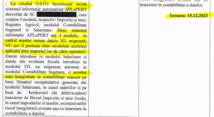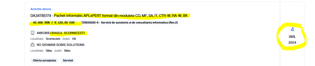 Bani dați degeaba la începutul anului 2024, pe 4 ianuarie, când tot pe achiziție directă, Primăria Scornicești a dat 45 600 Ron/peste 9 000 euro, pe un pachet informatic APxPERT, program cumpărat deja din 2022, dar neimplementat. CC:”La nivelul UAT Scornicești există sistemul informatic automatizat APxPERT dezvoltat de SC Sobis Srl , care conține 4 module , respectiv, impozite, taxe, Registrul agricol, contabilitate și salarizare, dar în cadrul acestui sistem datele nu migrează, nu pot fi preluate între modulele aceleiași aplicații prin importul lor de către operatori”.