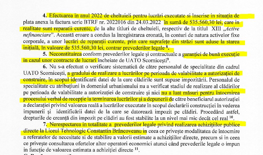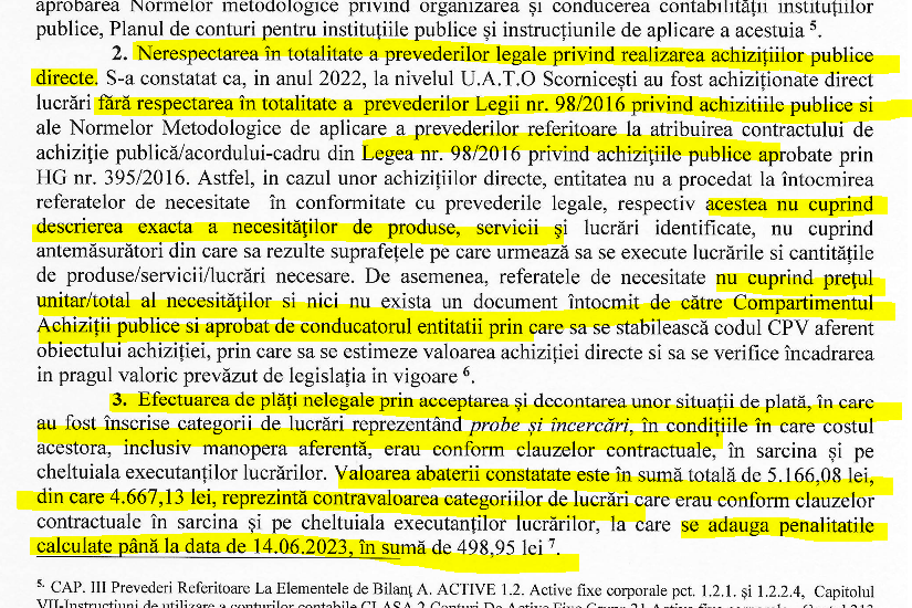 Raportul Curții de Conturi pentru anul 2022, care a auditat Primăria Scornicești, în luna august 2023, dovedește lucrările încredințate preferențial cartelului organizat, prin nerespectarea în totalitate a procedeului achizițiilor directe prin ofertă cumpărată. Așa a băgat Tudor banii bugetului local în portofelul abonaților preferați. O serie de abateri și nereguli care fac praf viziunea ”integritate și obiectivitate” a celui care se jură că nu fură.