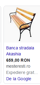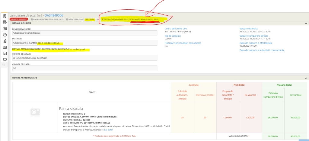 30 de bucăți, băncuțe stradale din cadru metalic, șezut și spătar din lemn. A negociat Tudor/autoritatea, și-a cerut 1.200 lei per bancă. Florea a plusat și s-a urcat pe Seap cu 1.500 lei/băncuța. Total din bugetul local/45.000,00  RON (9.047,77  EUR), fără Tva!