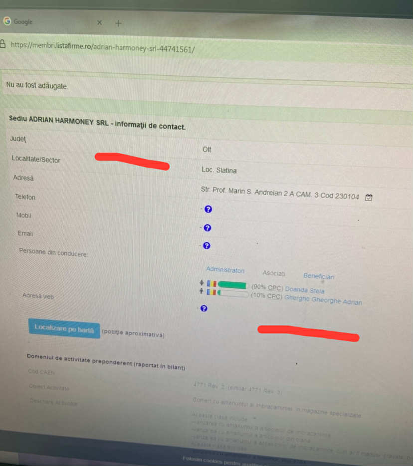 Firma face parte dintr-un grup de Srl-uri, 6 la număr, la care sunt acționari și administratori Stela Doandă și Gherghe Gheorghe Adrian. Pe Adrian Harmony Srl, Stela Doandă are 90 la sută acțiuni și este și administratorul firmei, diferența de 10 la sută revenindu-i lui Adi Gherghe, cum îi spun prietenii.