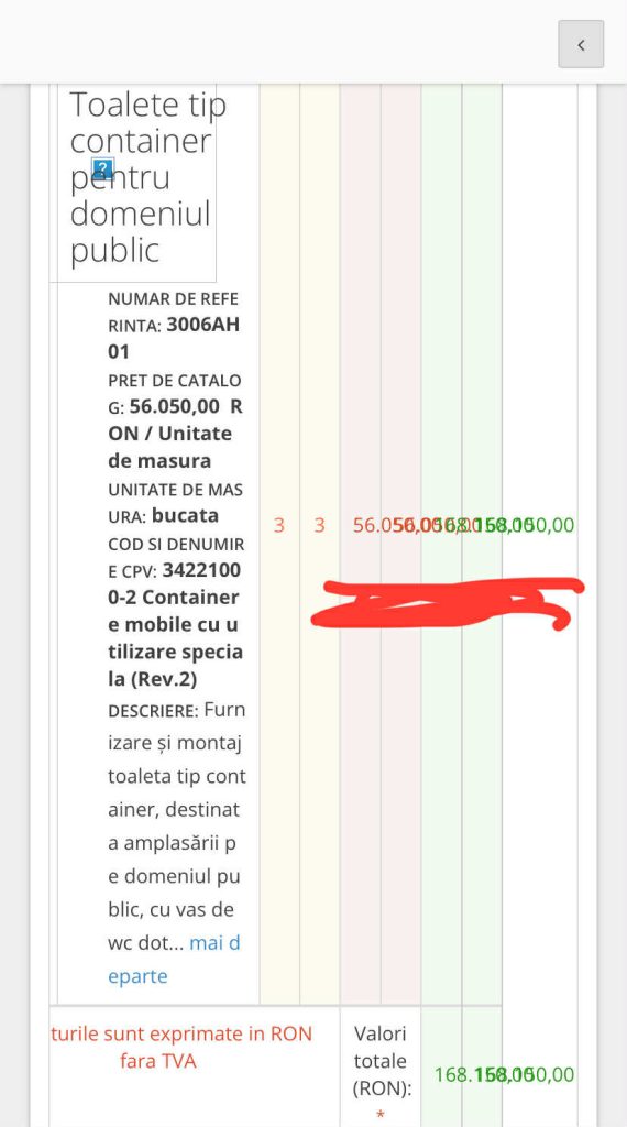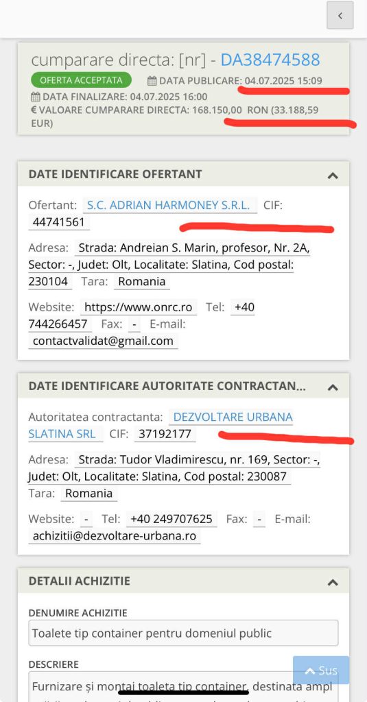 Pe achiziție directă, cum altfel?! În 4 iulie 2025, Dezvoltare Urbană Slatina cumpăra oferta Adrian Harmony Srl pentru achiziționarea și instalarea a trei containere mobile cu utilizare specială/toalete publice/ 3 bucăți, la prețul de 56.050 lei, fără Tva, bucata. Valoarea totală a achiziției însuma 166 150 lei/33 630 Euro/fără Tva.