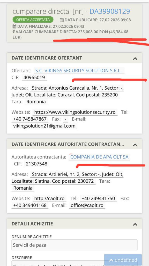 ATRIBUIREA DIRECTĂ a pazei sediului CAO din Slatina este făcută, ca și anul trecut, aceleiași firme din Caracal: SC Vikings Security Solution Srl. Firma înființată în 2019 a suferit mai multe modificări în acționariat, ultima în 15.10.2024: