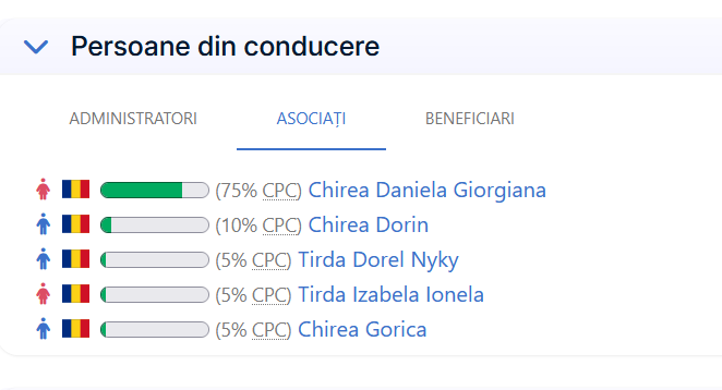 1. CHIREA DANIELA-GIORGIANA – 75% din capitalul social, detine 22.515 parti sociale a cate 10 lei fiecare, in valoare totala de 225.150 lei;