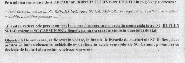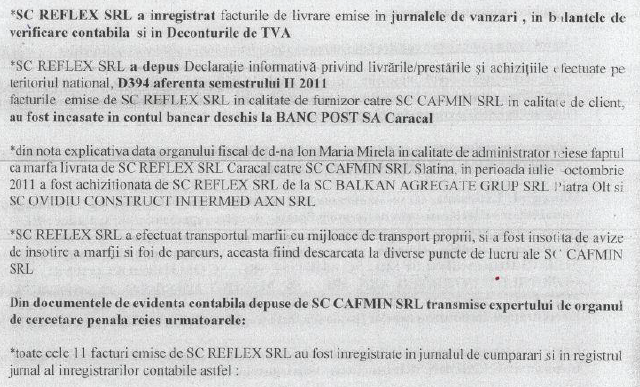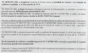 Din actul de constatare ANAF întocmit în septembie 2016, a rezultat faptul că SC REFLEX SRL ar fi evidențiat în actele contabile și alte documente legale operațiuni comerciale cu o serie de societăți, care ar fi fost fictive și fără scop economic menite să diminueze creanțele fiscale datorate la bugetul de stat, prejudiciul adus fiind de 626.763 lei/375.914 lei TVA și peste 250 mii lei, impozit pe profit. În relația comercială privind livrările de mărfuri/balast, sorturi ,nisip, de la Reflex SRL, către Cafmin, Tomescu Constantin, director general al firmei , deținătoare ea însăși de stație de balast , de ce oare o fi cumpărat de la Reflex Srl Caracal, poate din reflex…( ?!) a declarat că toate livrările făcute de Reflex către Cafmin, în diferite puncte de lucru au fost însoțite de documente legale, făcute cu transportul firmei caracalene, ele se regăsesc în diverde documente, devize, recepții de lucrări, au fost înregistrate în contabilitatea Cafmin și cu asta, pa ! Zice Tomescu, că nu era sarcina lui să verifice de la cine făcea Reflex achizițiile și dacă le declarau. Scurtă și la fel…pa, a fost și declarația administratorului Cafmin, Țiganu Loredana, care spune că e administratorul firmei din 2008, dar în fapt, de relațiile cu partenerii se ocupă numitul Tomescu , recitând aceeași poezie ca a „generalului„ societății : ea nu cunoștea nici furnizorii, nici beneficiarii, iar de Reflex nu a auzit nici în viața asta, nici în altă viață !