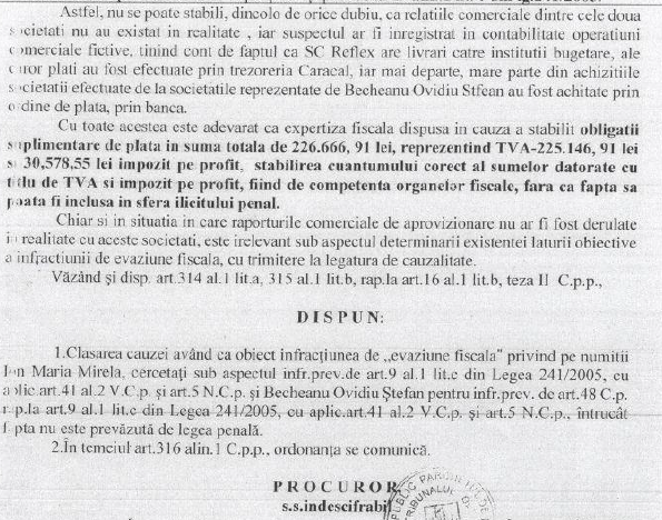 „Cu toate acestea este adevărat că expertiza fiscală dispusă în cauză a stabilit obligații suplimentare de plată în sumă totală de 226.666, 91 lei, reprezentând TVA-225.146,91 lei și 30.578, 55 lei impozit pe profit, stabilirea cuantumului corect al sumelor datorate cu titlu de TVA și impozit pe profit, fiind de competența organelor fiscale, fără ca fapta să poată fi inclusă în sfera ilicitului penal.