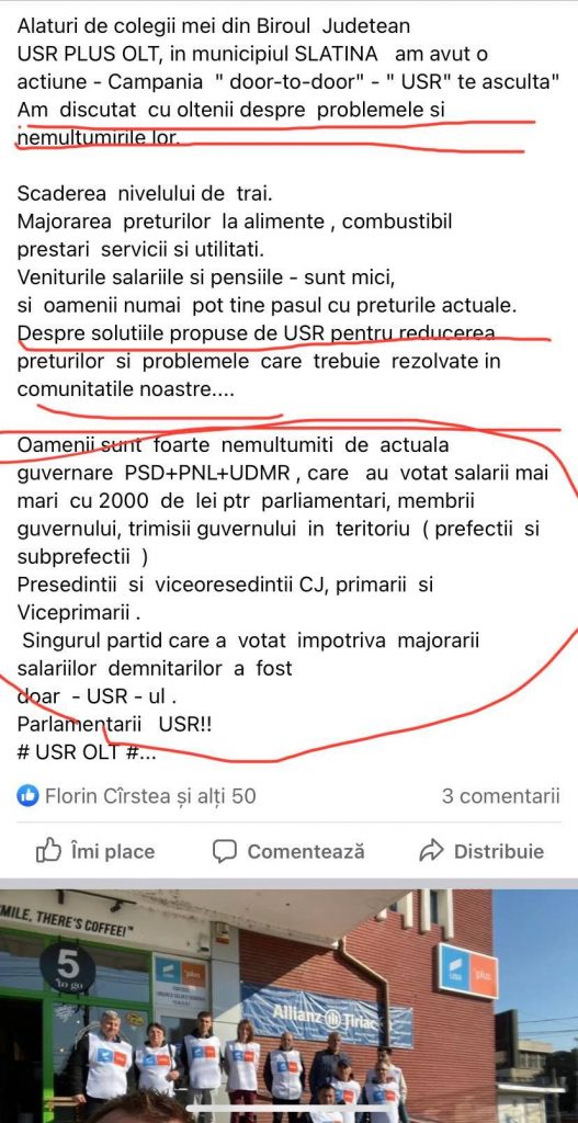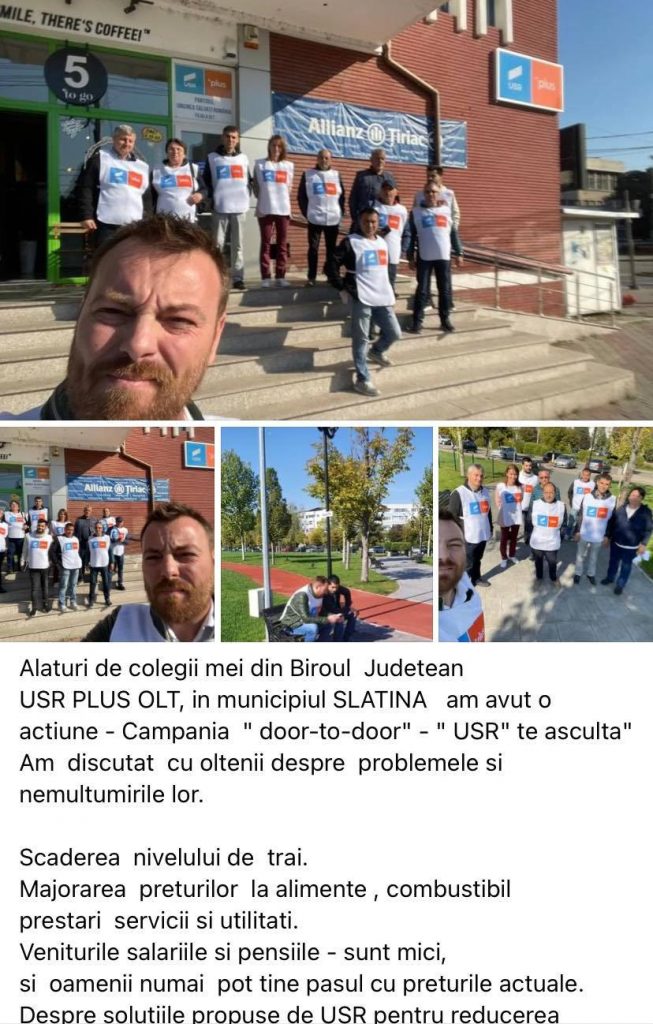 Și fiindcă soarele a fost zâmbăreț, că a înviat și muștele, ce s-a gândit Bădiciul șef la USR minus USR…?! Hai pe ștrase, că e ordin pe unitate , să vadă Drulă că mișcăm și noi din coadă. A sunat goarna, și-a strâns 11 adepți, cu el cu tot, s-au tras în poze pe scări la locație, și-a pus coeficientul de zero politică în prim plan, a făcut patru instantanee , din care trei cu mu, mu, mu și a dat drumul la treabă! Treabă mare, cum știe el de când s-a pus șef la filială! Se explicitează Bădiciul zero politică: ”am avut o acțiune-Campania ”door to door”-USR te ascultă” și publică și succesul acțiunii! În șezut, pe o bancă, lângă o tânără speranță. Asta probabil într-o pauză, dintr-un fragment de la cioc-cioc, cine e, sunt eu, Fănel de la usereu, și fac ”dor tu dor”. Bravo, Fănelutz!