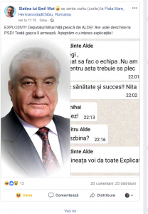 Dacă răspuns la intențiile sale de dezertare din ALDE Olt, și mai mult decât atât, dezmembrarea organizației , nu e, să fie declarații politice, marca dude, postate și șterse ulterior din prea multe comentarii împotrivă și prostie necitită, dar asumată ! ”Europa, te iubesc” ….zicea Mișu, pentru ca după, să se răzgândească ! Postările persistă în aceeași prostie a altora, îmbrăcând, emblematic, poza lui Mișu deputat, în aburi, stârnind râsete ! Chiar nu are, nimeni, curajul din organizație, să-i spună că e penibil ?! Mișu e același : de trei mandate, de la trei partide partide diferite, parlamentar ! Cu de trei ori pensie specială ! Succes în alegeri !